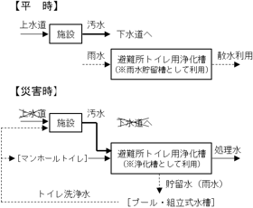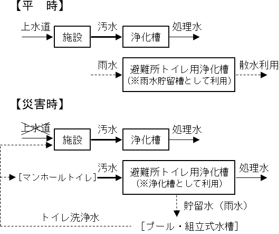 上記の事例以外にも、避難所トイレへの浄化槽の活用方法が提案されている8)。図−10は、浄化槽処理区域に避難所トイレ用浄化槽を設置する場合の例である。平時には雨水貯留槽として利用し、災害時に溜めた雨水を別の水槽に移してトイレ洗浄水として利用する。また、浄化槽のマンホール蓋もしくは上流側の配管上部にマンホールトイレを設置することで、災害時にトイレ数が不足した場合に対応する。